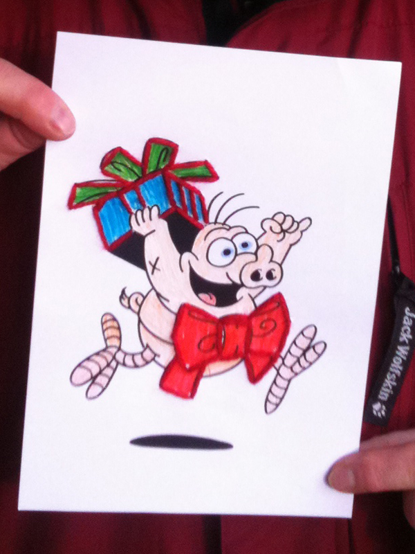 Druckt einfach das untenstehende Motiv aus – am besten auf dickerem Papier – malt mein Bild nach Belieben aus und bestickt es mit bunter Wolle. Und dann verschenkt eure selbst gebastelte Schweinachtskarte an eure Familie und Freunde.