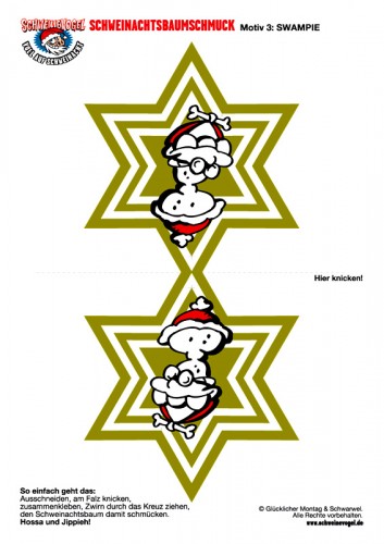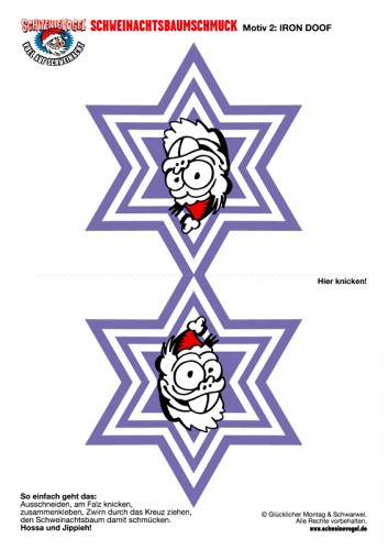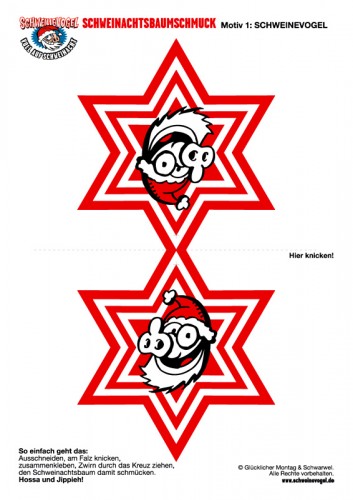 Ausschneiden, am Falz knicken, zusammenkleben, Zwirn durch das Kreuz ziehen und damit den Schweinachtsbaum schmücken.