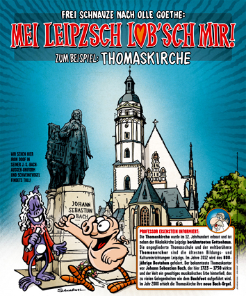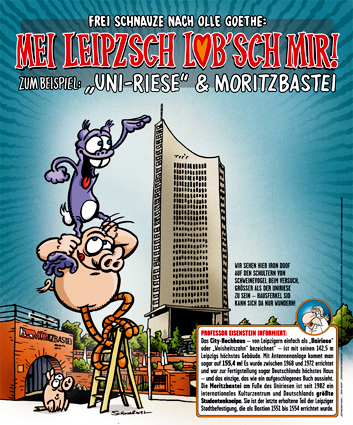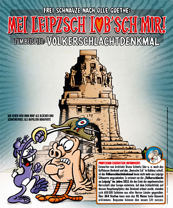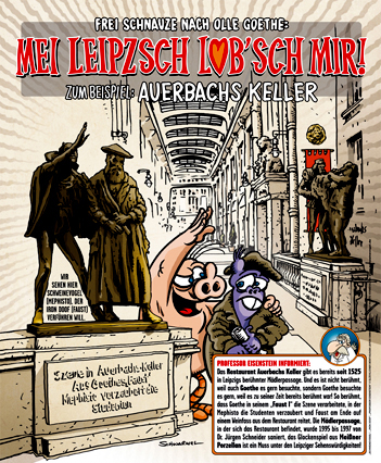 Am Anfang von “Mei Leipzsch lob`sch mir!” stehen dabei mit Völkerschlachtdenkmal, Thomaskirche, Uniriese und Moritzbastei sowie natürlich der Mädlerpassage mit Auerbachs Keller gleich die berühmtesten Bauwerke der Stadt – eben ganz Goethe verpflichtet.