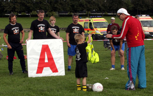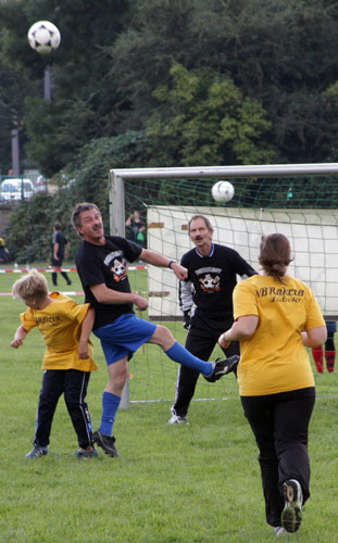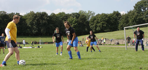 Nachdem das Schweinevogel-Team, das zu 99 % aus der Köhra-Connection bestand (1 % wurde von der Super-Spielenden-AGM-Praktikantin Anne gehalten), im wahrsten Sinne des Wortes wie die Fussball-Götter gespielt hat, waren wir auf die Zwischenrunde gespannt. Leider wurde uns der Strauß`sche Hang zum Perfektionismus zum Verhängnis – während sich die auserwählten 6 Schweinevogel-Spieler noch in die vorgeschriebenen Warnwesten quälten, spielten die Gegner bereits regelwidrig ohne Weste weiter und so gerieten wir ins Hintertreffen. Nach einem Veto unserer Nachbarn gegenüber den Schiris kam es dann zum alles entscheidenden Stechen, das wir leider wegen dem absoluten Können unseres Kapitäns (er schoss den Ball genau in die kleinste Ecke des Dreiecks und traf nicht eine Büchse) nicht für uns entscheiden konnten.