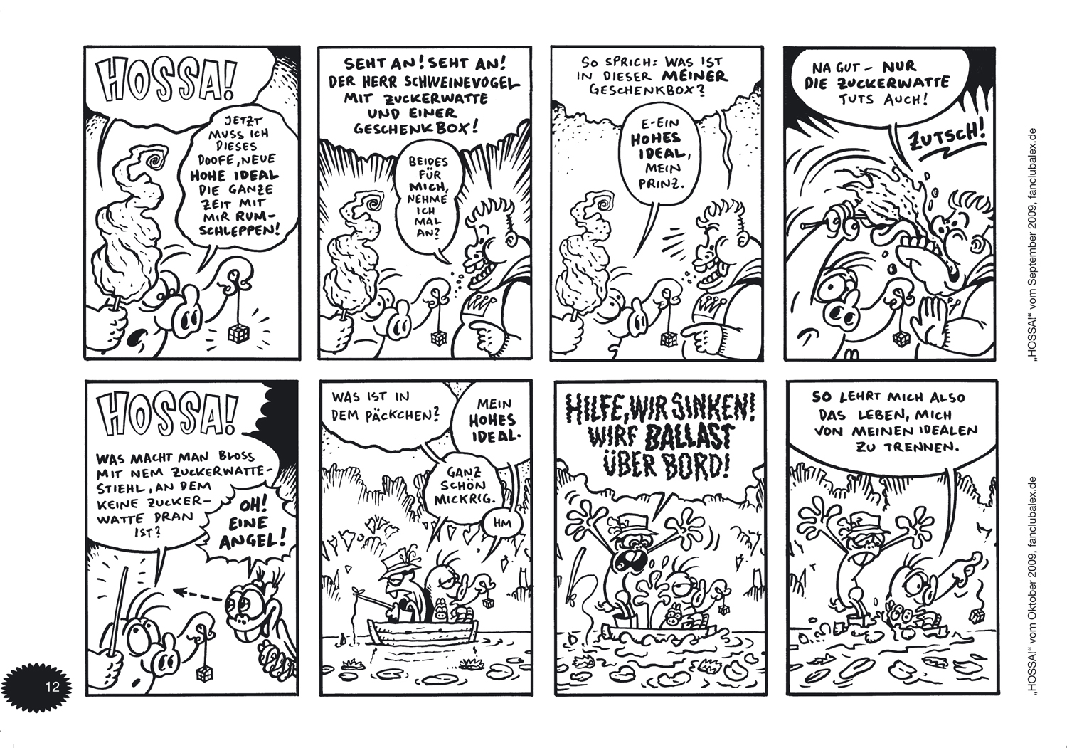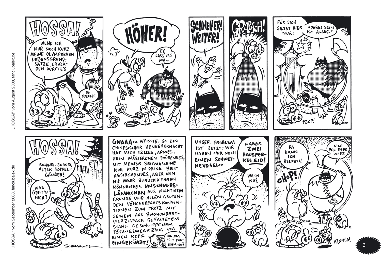 | Die Hauptgeschichte enthält alle bisherigen Folgen des wöchentlich auf fanclubalex.de erscheinenden "HOSSA!"-Strips um Schweinevogel und seine Knuddelfreunde. Daneben enthält das Heft alle bisher erschienenen Extra-"HOSSA!", die u. a. auf Spiegel Online, im Uncle Sally*s oder in Ausstellungen präsentiert wurden. Dazu gibt es das Wimmelspiel "Iron Doofs Olivenweg", Prof. Eisensteins beliebten "Rätsel-O-Naut" und viel Hintergrundwissen für den modernen Nerd von heute.