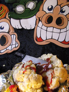Mit Ketchup (Blut-Ersatz) und Mayo, Käsesauce oder Soja-Creme als Hirnschmalz-Ersatz gruselig verzieren.